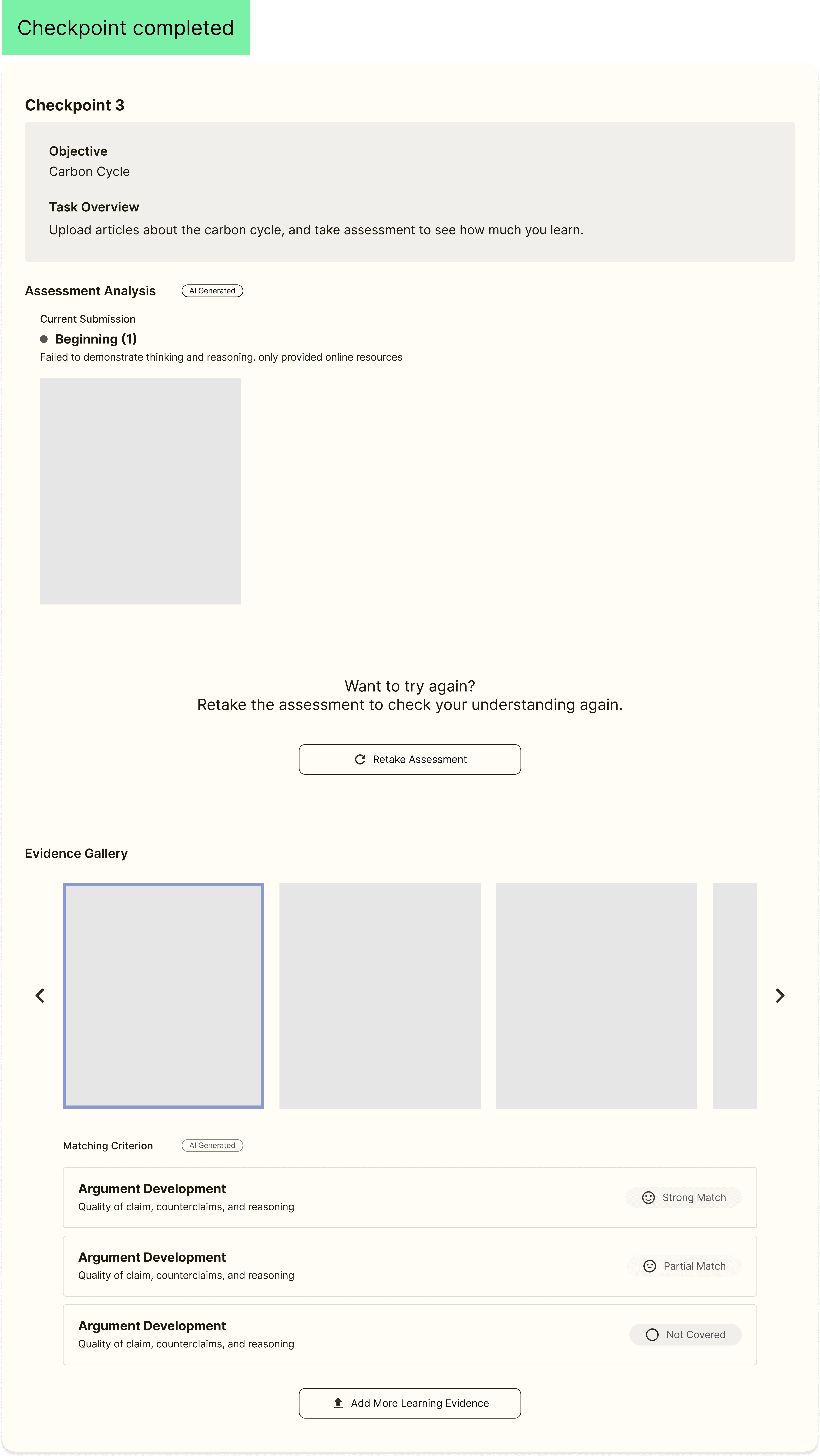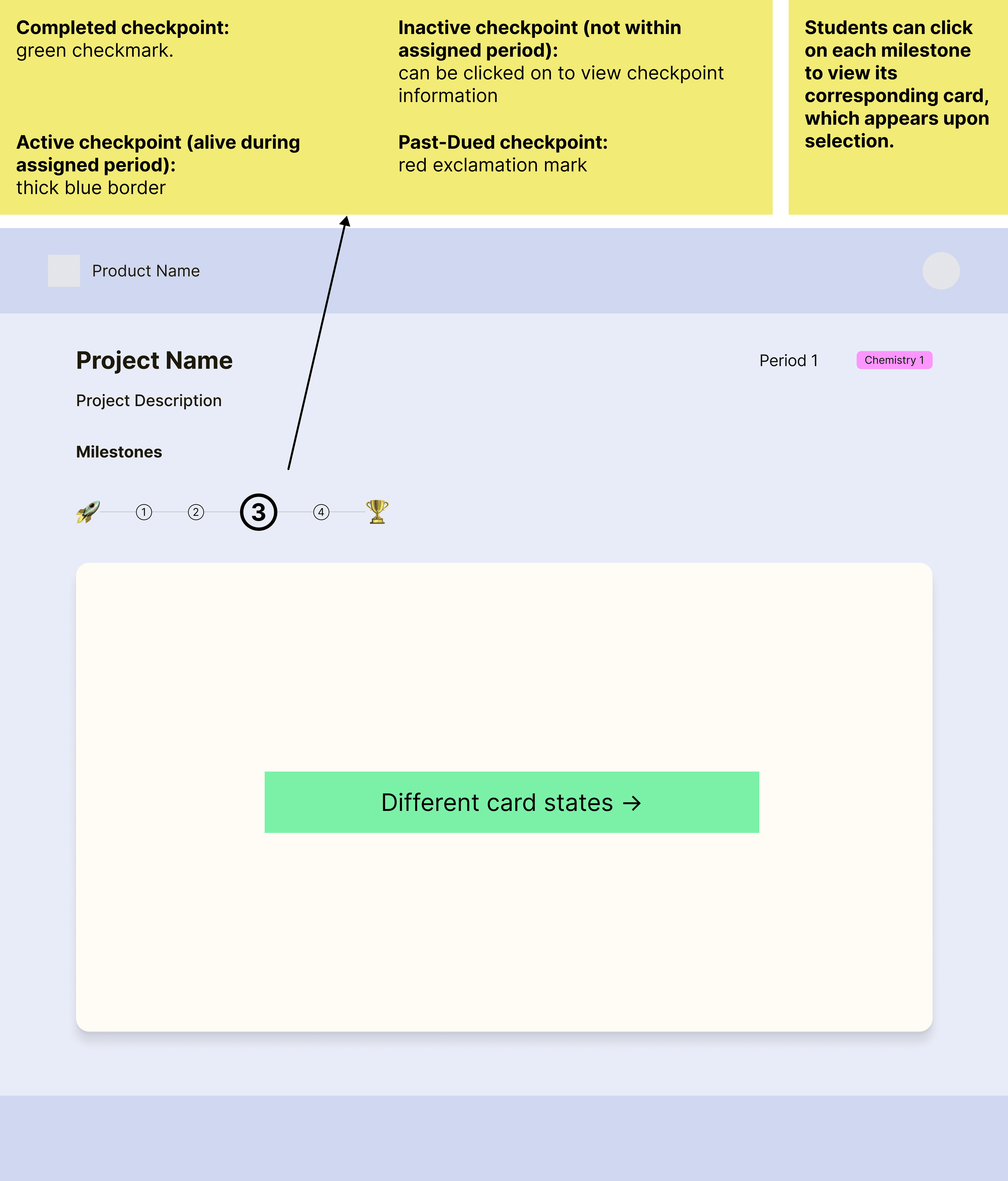 Mid-fi screens mapping the student milestone flow and 4 checkpoint states