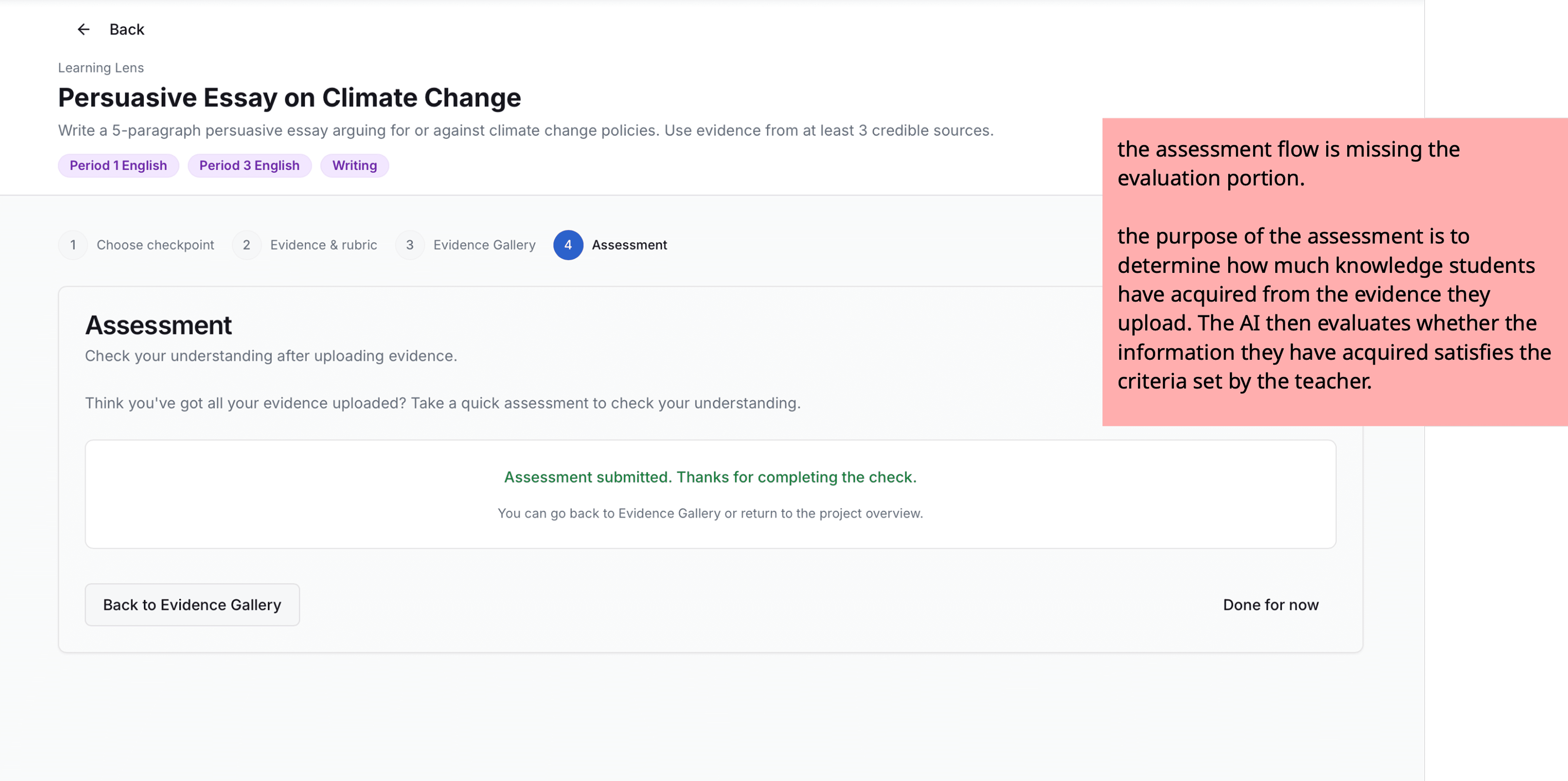 We designed the flow so student work is automatically analyzed by AI against the rubric, and the results surface to the teacher in real time.